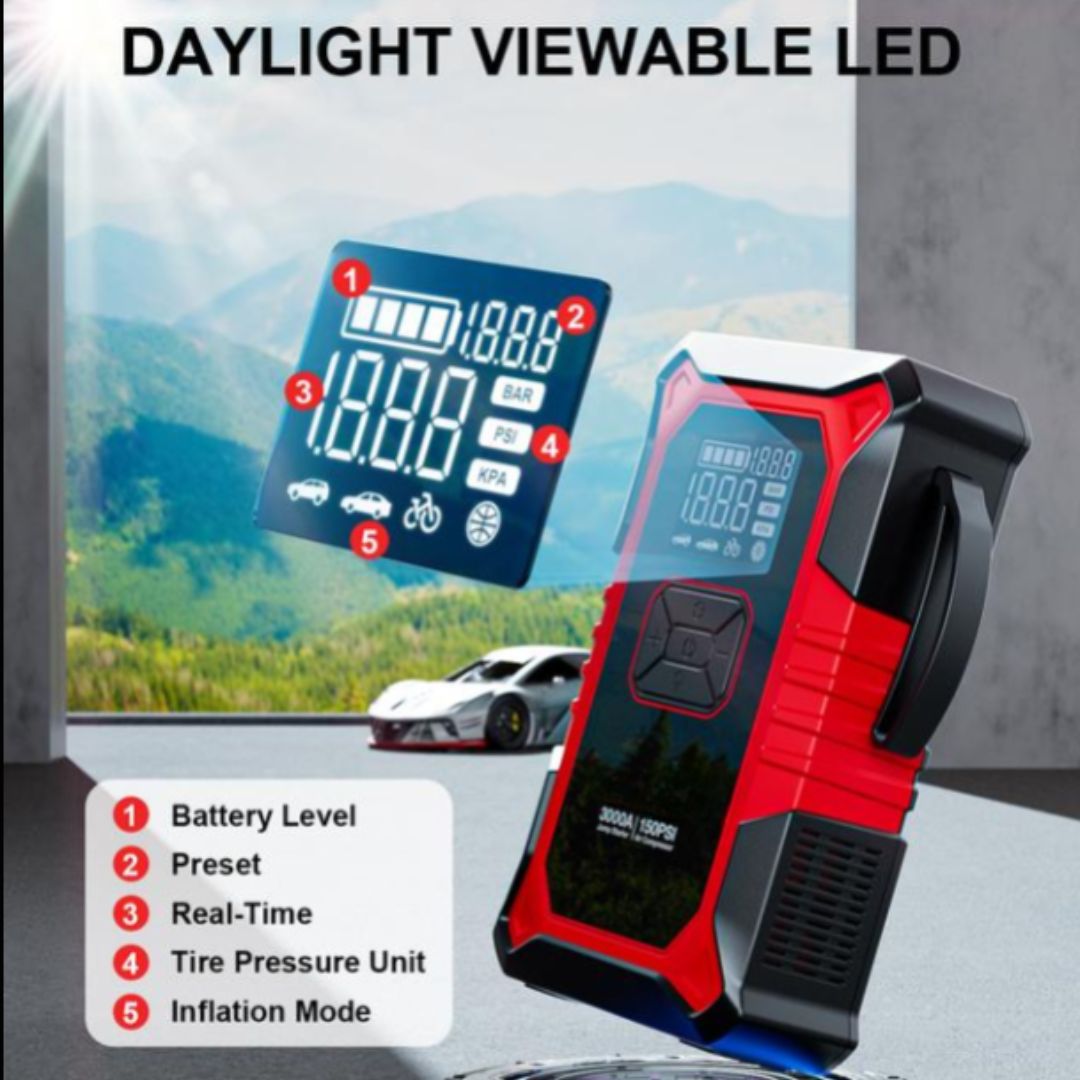 A flat tire can ruin your plans, but with the built-in air compressor, you can inflate tires on the spot. Just set the PSI, press start, and it does the rest, keeping your day on track without hassle.